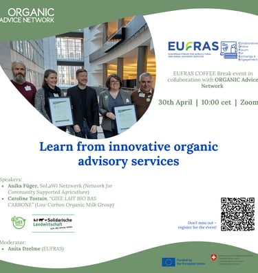 Don’t miss the EUFRAS Coffee Break on 30 April, where we will explore innovative organic advisory services and learn from inspiring practical approaches shaping the future of organic farming across Europe!