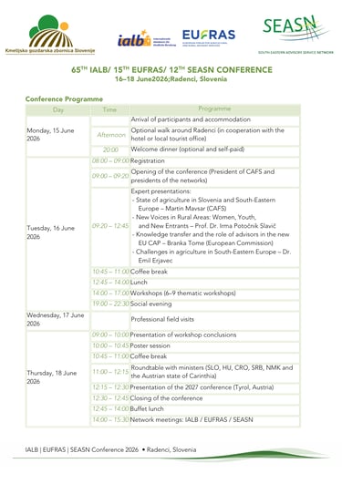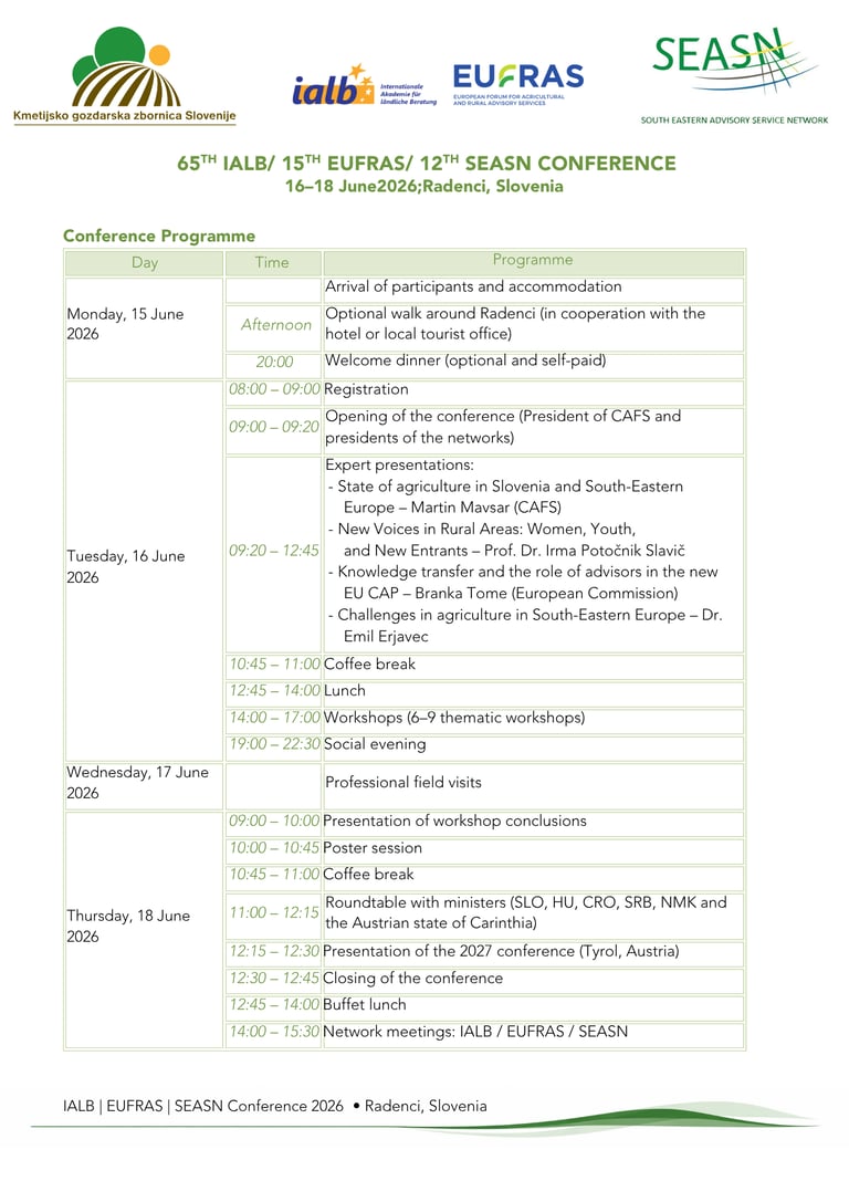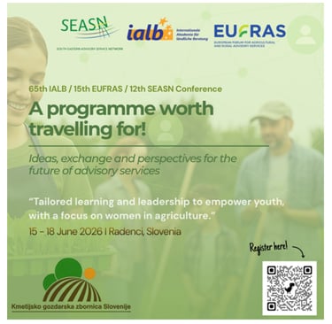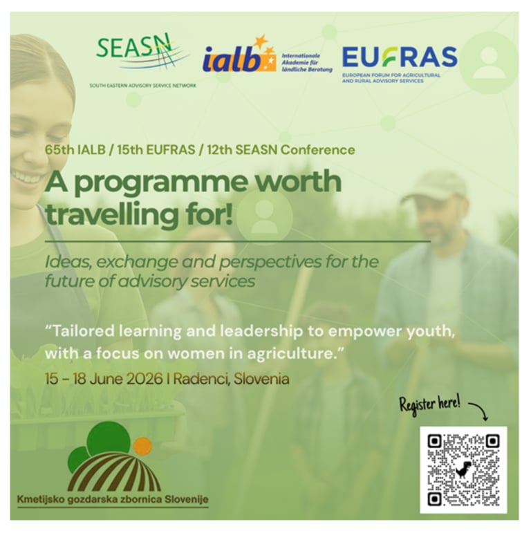The annual IALB, EUFRAS, and SEASN Conference, taking place on June 16–18, 2026, in Radenci, Slovenia, will bring together agricultural advisors, experts, institutional representatives, and practitioners from across Europe. The conference will explore practical approaches, innovative advisory models, and good practices that promote inclusion, leadership, and effective knowledge exchange.