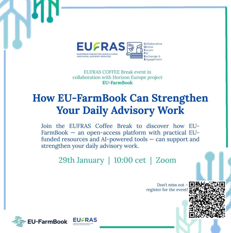 Join this EUFRAS Coffee Break to learn about EU-FarmBook, an open-access platform designed to make EU-funded knowledge easier to find and use in advisory practice.