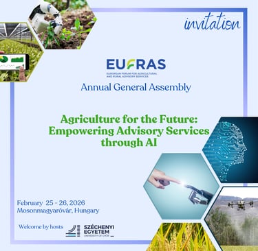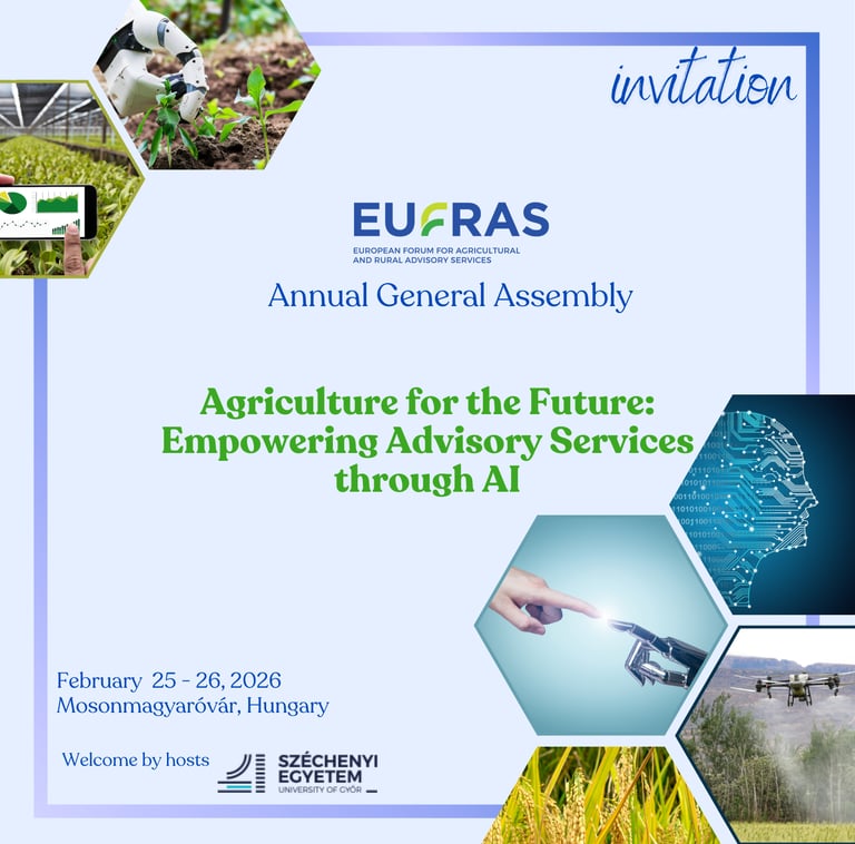 EUFRAS will hold its annual in-person Members’ General Assembly on 25–26 February 2026 in Mosonmagyaróvár, Hungary, in cooperation with Széchenyi István University. The General Assembly will take place under the overarching theme “Agriculture for the Future: Empowering Advisory Services through AI.”